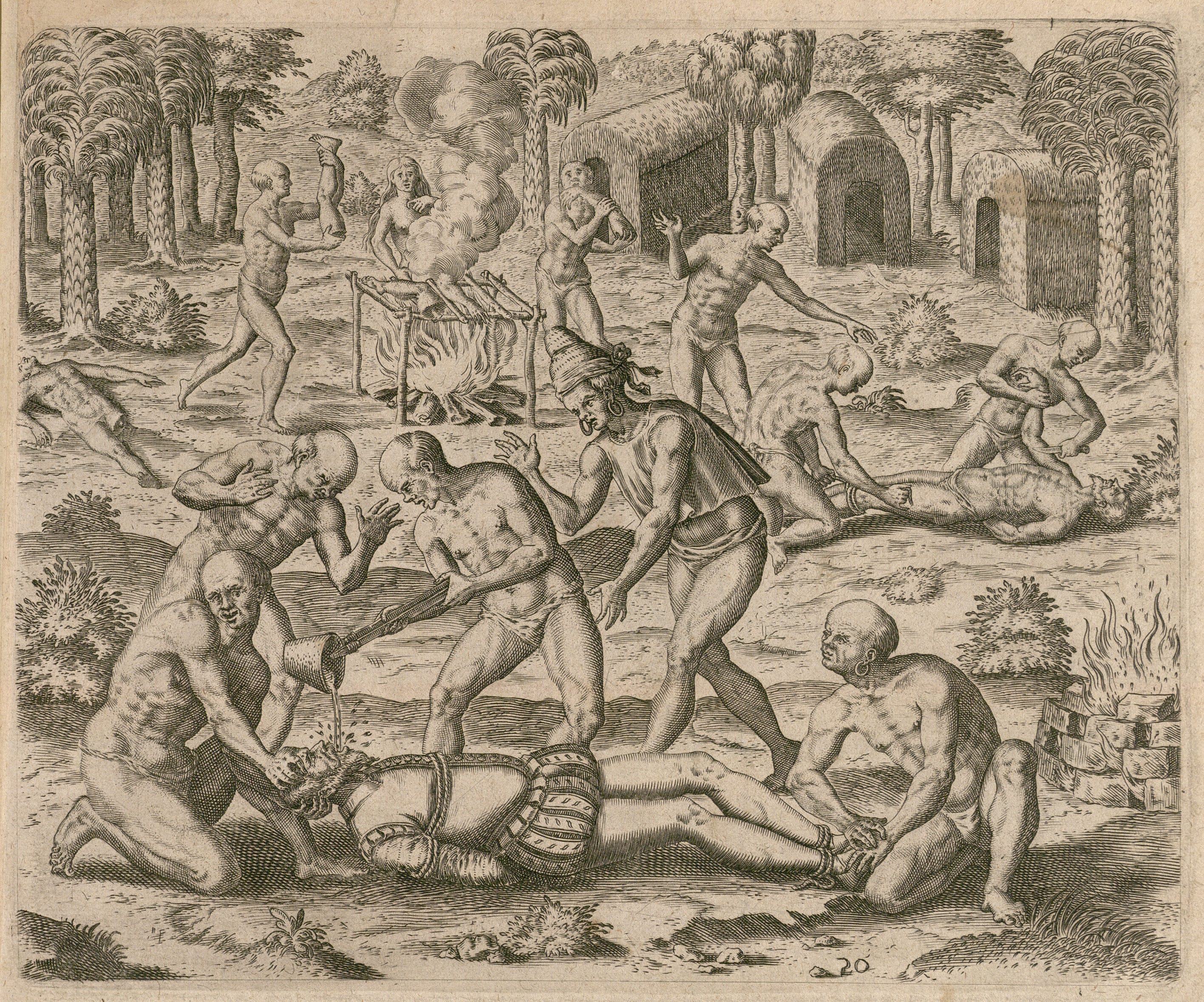 In the foreground, the viewer sees indigenous men, apparently identifiable by their hairstyles, jewelry, and lack of clothing, in the process of cutting off the limbs of their ‘enemies’. This is similar to De Bry’s engraving, yet differs in subject matter as this is meant to convey the battle conventions of indigenous peoples. To the center of the piece, one may also see other men marching with human limbs affixed to what appear to be spears. At right, more men are seen surrounding a fire which cooks a head, as well as a man standing triumphantly before it holding a leg in his right hand and a head in his right, both high in the air. The scenes in this artwork further contribute to the pervasive ideas of indigenous peoples having customs that are overtly different, and therefore more negative and fearsome, than ones practiced by Europeans of the Old World. This is extremely dangerous because many of the depictions of Native Americans, such as this one, are not completely factual and instead aim to spread misinformation that they have never had any intention of correcting. This reveals to historians that not only were Europeans often overcompensating for their own fears of Indigenous peoples and their practices, but that they also selfishly were void of any intentions of attempting to understand what they did not.